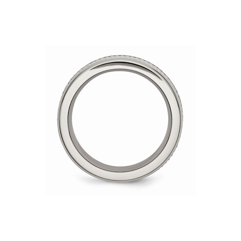 This attrACTIVE 8mm wide wedding band is made from stainless steel, and features crisscross cut accents around the shank. This stylish brushed and polished finish band comes in half finger sizes 7.50-13.