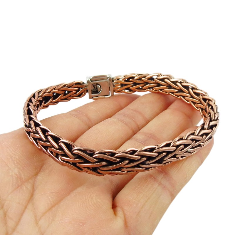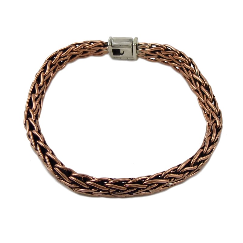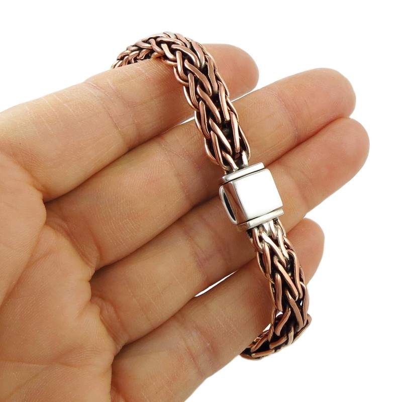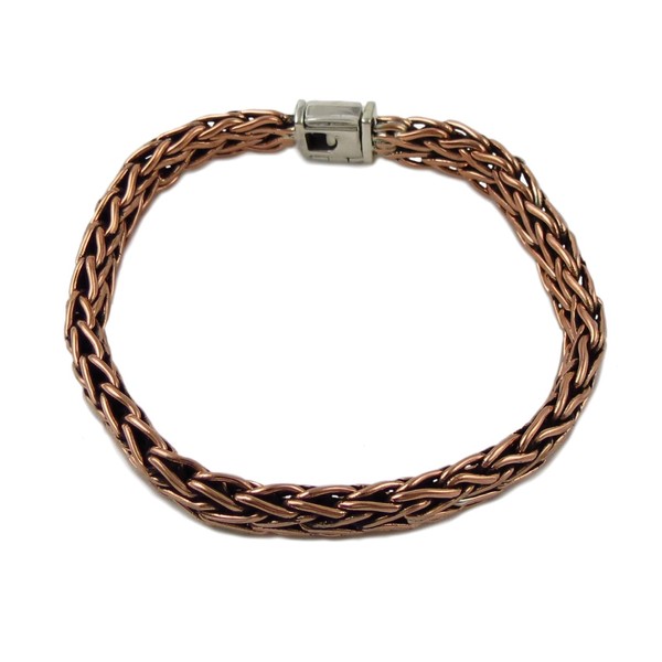 Heavy copper weaves around the wrist in this modern mixed metal design. The bracelet closes on a heavy double hook and tab clasp.