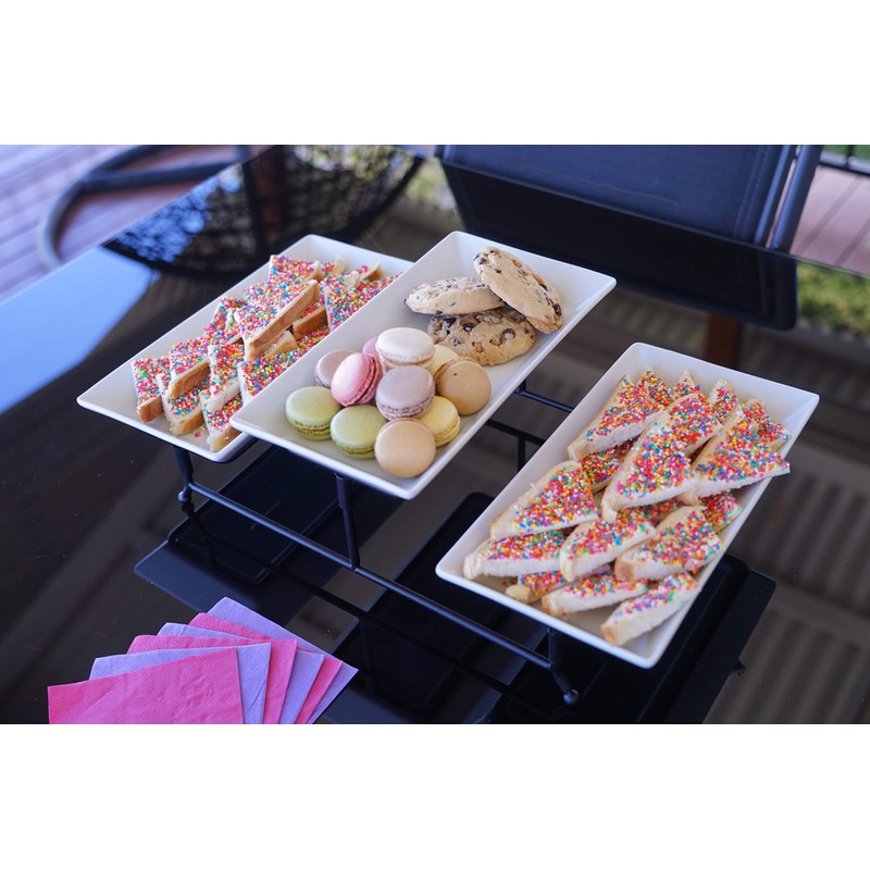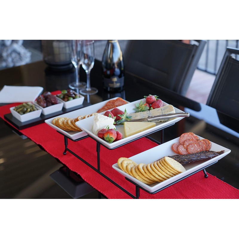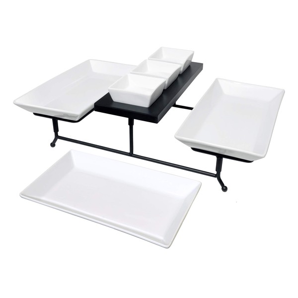 - EASY ASSEMBLY AND STORAGE: The sturdy metal wire serving tray stand collapses and the plates and bowls stack for compact storage.