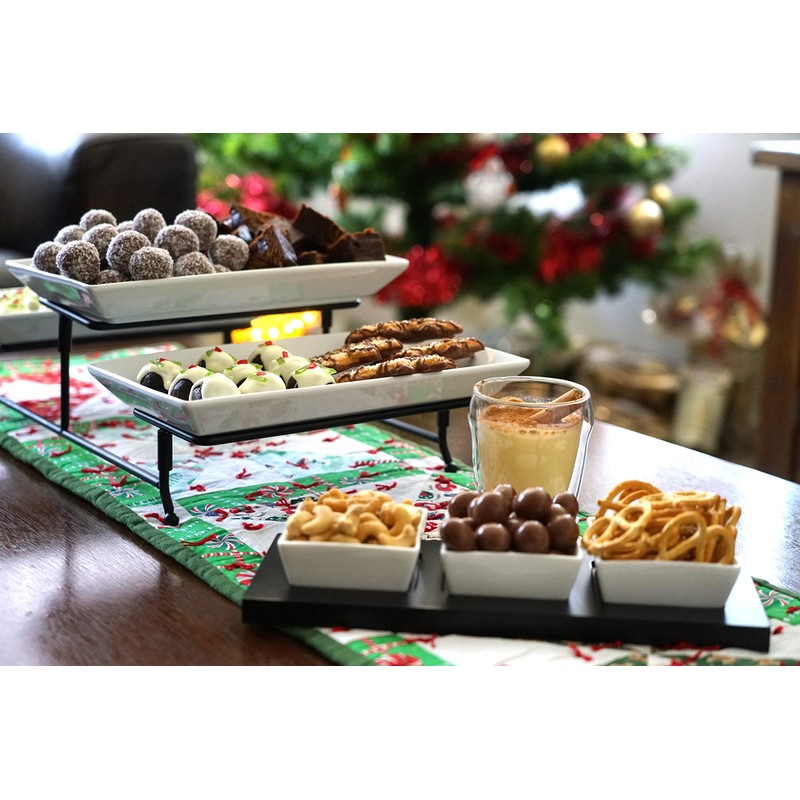 The Most Versatile 3 Tier Serving Tray. Collapsible Metal Stand with 3 Plates & 3 Bowls on Black Wood Base. Tiered Tray Party Food Server Display for appetizers, Cupcakes, Fruit, Cheese, Desserts.