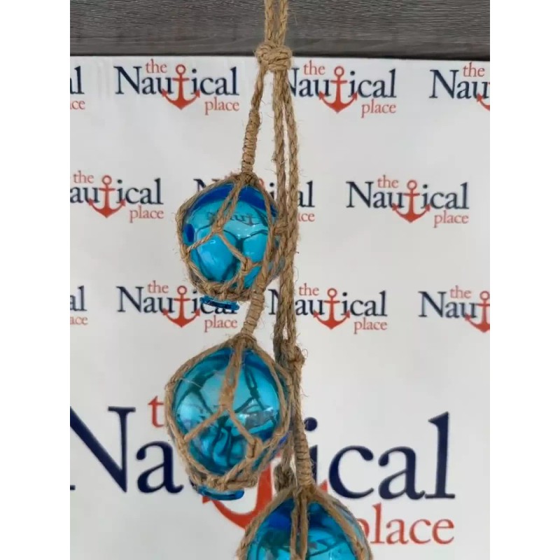These beautiful glass fishing floats are all connected and encircled with knotted jute rope. This is truly a stunning piece of nautical decor. There are 5 floats total and each measures 2" in diameter (across). Measures approx. 16" in total length when hanging.
