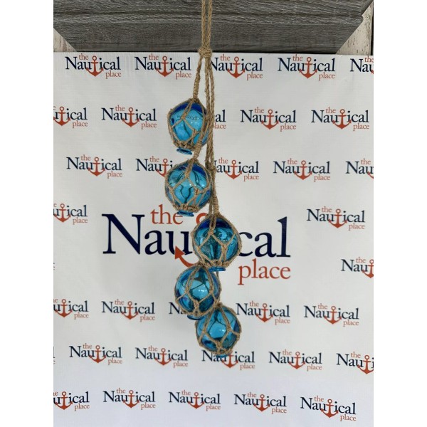5 x 2" Aqua Glass Fishing Floats On Rope, Nautical Fish Net Decor, Light Blue