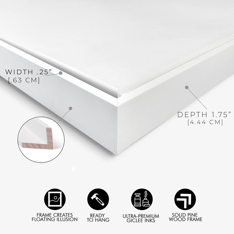 - Hand-framed with modern White satin floater frame. The giclee print floats within this thin frame, that creates the illusion of suspended artwork