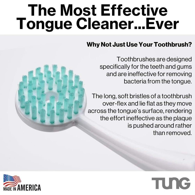 - COMFORTABLE & EASY TO USE: The TUNG Brush is designed to effectively reach the back of the tongue where the majority of bad breath comes from. It's design helps to minimize the gag reflex which over time, if you do have one, will go away with regular use. The low profile, wide head & ergonomic handle means you can effectively reach the back of your tongue easily. You’ll comfortably brush every inch of your tongue, so you can be confident that your breath is completely fresh.