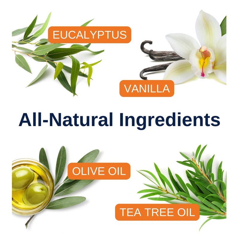 - ALL NATURAL - A unique mixture of only 4 natural ingredients: Tea Tree Oil, Blue Mallee Eucalyptus, Vanilla, and Olive Oil.