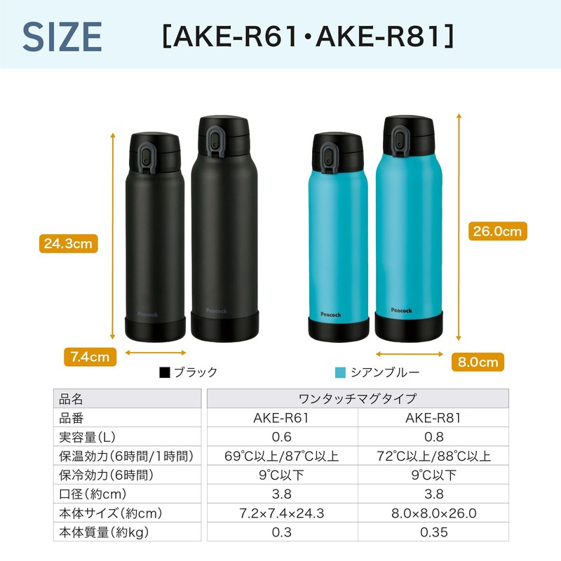 The-peacock AKE-R61 AC Water Bottle, 10.3 fl oz (600 ml), One Touch, Thermal, Cold Insulation, Compatible with Sports Beverages, Large Capacity, Bottom Cover, Easy Care, Cyan Blue