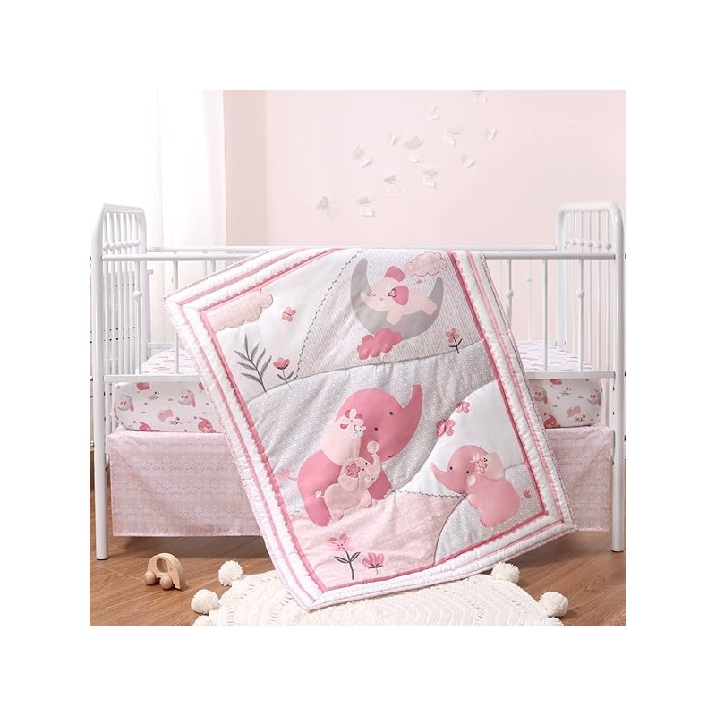 The Peanutshell 3 Piece Baby Crib Bedding Set for Girls - Newborn, Infant & Toddler Nursery Bed Set Decor with Fitted Crib Sheet, Dust Ruffle Comforter - Pink Elephant