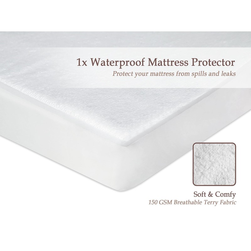 - 💧 Waterproof Mattress Protector | The terry fabric of this waterproof mattress protector is made from a cozy and highly breathable polycotton blend ensuring a comfortable and sleep. Equipped with a waterproof TPU membrane, it provides reliable defense against liquids, spills, and those inevitable nighttime accidents. The flexible skirt and elastic design ensures a perfect fit, adapting effortlessly to your mattress. Rest easy knowing your mattress is fully safeguarded, while you enjoy a peaceful night's rest.