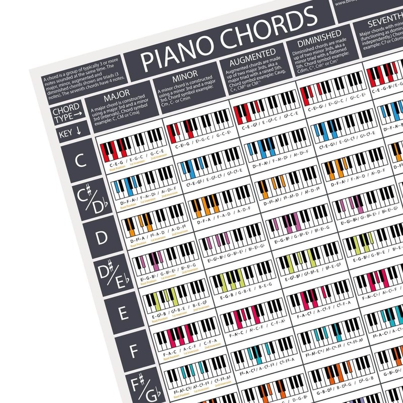 - ESSENTIAL CHORDS - The poster shows all 60 of the major, minor, augmented, diminished and dominant chords in every key, so it’s perfect for beginners that can’t read music. Simply refer to the chord illustration you need to play and away you go.