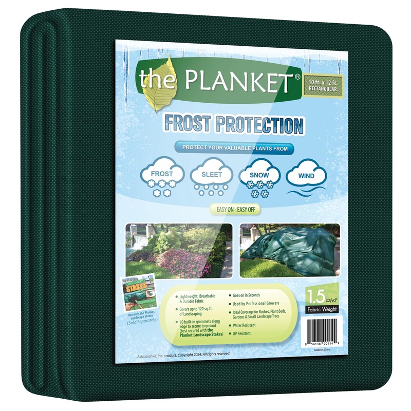 The Planket is a plant blanket that helps protect your valuable plants from frost, sleet, snow, & cold winds. This rectangular shaped plant cover measures 10 feet by 12 feet & covers up to 120 square feet and is made of spun-bonded, nonwoven material. There are 10 built-in grommets along edge to secure the Planket to ground (best secured with the Planket Landscape Stakes). The lightweight, but durable material allows plants to breathe. Goes on in seconds and folds up nicely for easy storage. Available sizes include the 6 ft. Round, 8ft. Round, 10ft. Round, 10 ft. x 12 ft. Rectangular, 10 ft. x 20 ft. Rectangular & 6 ft. x 50 ft. Roll.