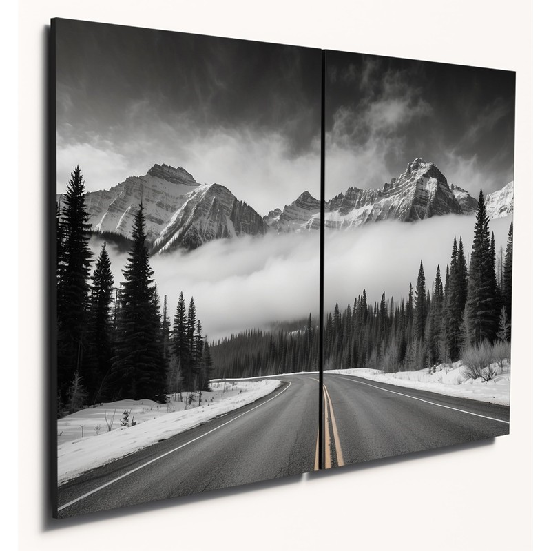 The Plum Penguin Canadian Rockies Mountain Road Fog Scene, A4 Dual Wooden MDF Wall Art, Monochrome Home Decor Canvas Alternative 40 x 30cm