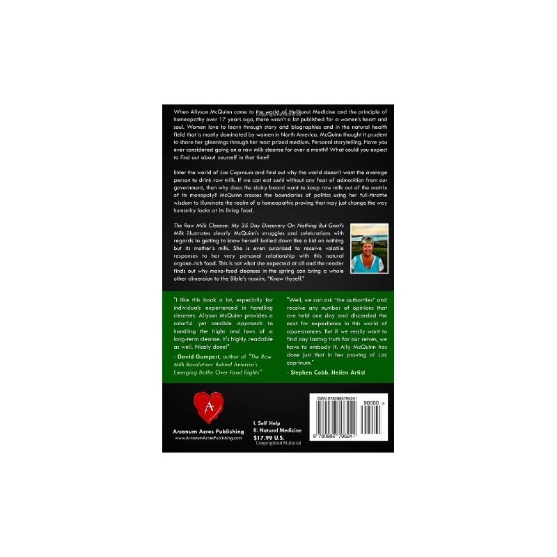 When Allyson McQuinn came to the world of Heilkunst Medicine and the principle of homeopathy over 17 years ago, there wasn't a lot published for a woman's heart and soul. Women love to learn through story and biographies and in the natural health field that is mostly dominated by women in North America, McQuinn thought it prudent to share her gleanings through her most prized medium. Personal storytelling. Have you ever considered going on a raw milk cleanse for over a month? What could you expect to find out about yourself in that time? Enter the world of Lac Caprinum and find out why the world doesn't want the average person to drink raw milk. If we can eat sushi without any fear of admonition from our government, then why does the dairy board want to keep raw milk out of the matrix of its monopoly? McQuinn crosses the boundaries of politics using her full-throttle wisdom to illuminate the realm of a homeopathic proving that may just change the way humanity looks at its living food. The Raw Milk Cleanse: My 35 Day Discovery On Nothing But Goat's Milk, illustrates clearly McQuinn's struggles and celebrations with regards to getting to know herself boiled down like a kid on nothing but its mother's milk. She is even surprised to receive volatile responses to her very personal relationship with this natural orgone-rich food. This is not what she expected at all and the reader finds out why mono-food cleanses in the spring can bring a whole other dimension to the Bible's maxim, Know thyself. "I like this book a lot, especially for individuals experienced in handling cleanses. Allyson McQuinn provides a colorful yet sensible approach to handling the highs and lows of a long-term cleanse. It's highly readable as well. Nicely done!" -David Gumpert, author of The Raw Milk Revolution: Behind America's Emerging Battle Over Food Rights