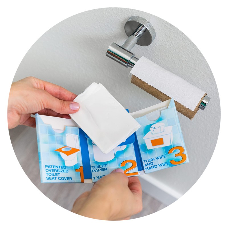 The Restroom Kit Great for Travel (30-Pack) Portable Disposable Oversized Toilet Seat Cover, 3ft 3Ply Toilet Paper, Hand & Flushable Tush Wipe