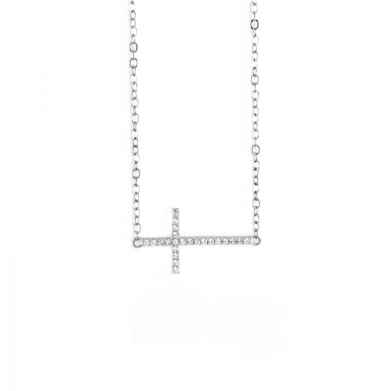 Do not compromise fashion when showing off your religious side. Today's hottest trend, sideways crosses, are both fashionable and spiritual. This sterling silver cross necklace features a simple link chain and is adorned with a sideways cross that sparkles with clear cz stones. Necklace measures 16" long and comes with a 2" extender for the added advantage of wearing it as an 18" necklace.