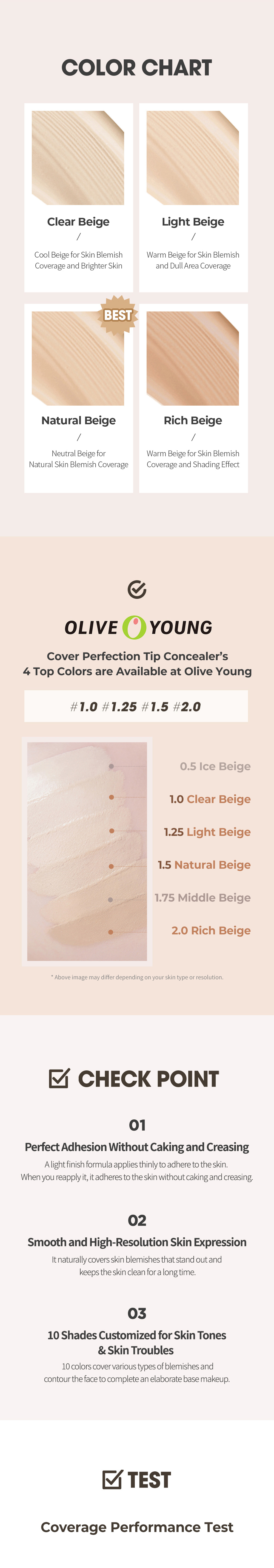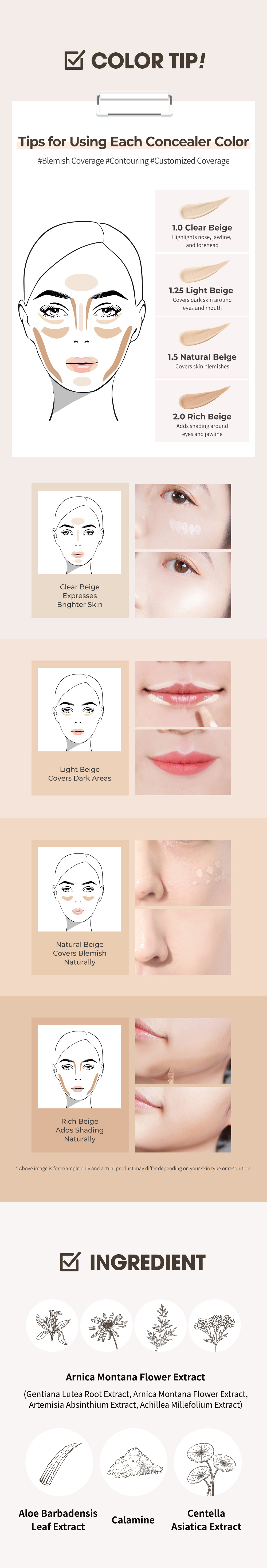 Comes in 4 colors: Clear Beige, Light Beige, Natural Beige and Rich Beige. Can be used for various purposes: Clear Beige for highlight effect, Light Beige for tone-up effect around eyes and lips, Natural Beige for covering blemishes and Rich Beige for shading effect.