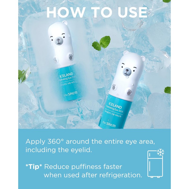 SOOTHING EYE BALM WITH ICELAND GLACIER WATER: The Saem Iceland Hydrating Eye Stick is enriched with the blessing of million-year-old glaciers. Our under-eye mask contains Iceland Moss, Iceland Plant, Xylitol, Niacinamide, Adenosine, and other Active Marine Ingredients.