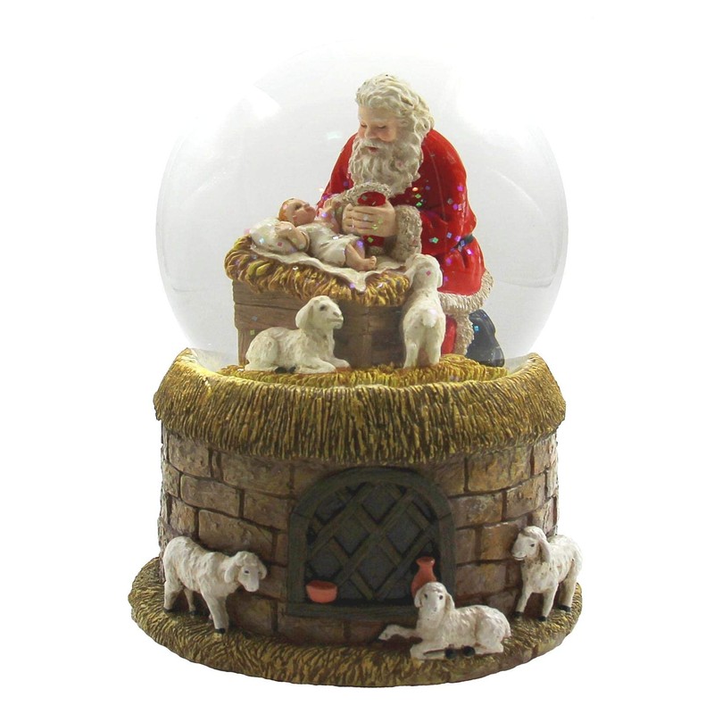 - The adorable water globe features Santa over the manger with baby.