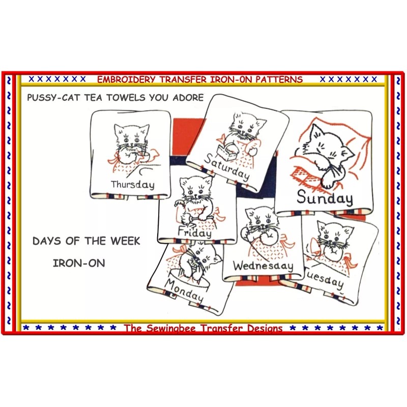THE SEWING BEE 2 KITTEN - CATS embroidery Transfer days of week pattern IRON-ON TEA TOWELS 206