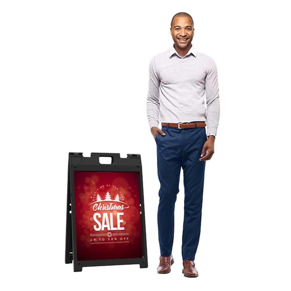 The "Signicade MDX" Sign Stand. This is the same as our classic Signicade Deluxe, but with a smaller 18" wide x 24" tall sign area. It also has the same "drop in" feature as the Signicade Deluxe. COLOR: Black.