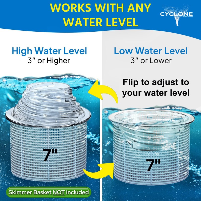 - *DOES NOT FIT ABOVE GROUND POOLS. FITS 7" SKIMMER BASKET: (Please note: Skimmer Basket Not Included) The PATENTED Cyclone is an innovative design that sits on top of the pool skimmer basket, increasing the water flow and creating a powerful suction that helps to draw in debris from the surface of your pool. This means that leaves, bugs, and other debris will be more effectively removed from your pool, making it easier for pool maintenance.