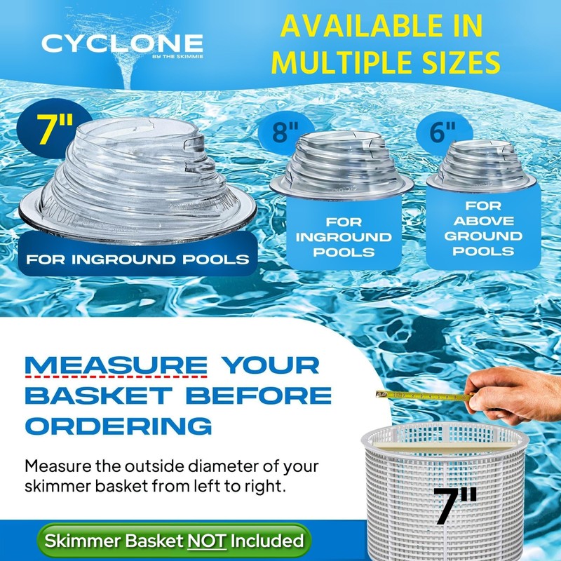 - Universal Fit: The Cyclone is designed to fit any 7" pool skimmer basket, making it a versatile swimming pool accessory for above-ground or in-ground pools. The Cyclone is a great choice for keeping your pool clean and debris-free.