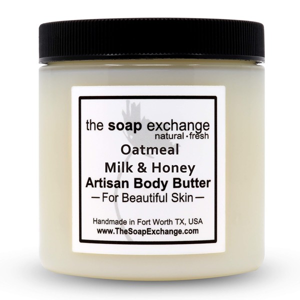 The Soap Exchange Body Butter - Oatmeal, Milk & Honey Scent - Hand Crafted 4 fl oz / 120 ml Natural Artisan Skin Care, Shea Butter, Aloe Vera, Nourish, Moisturize, & Protect. Made in the USA.