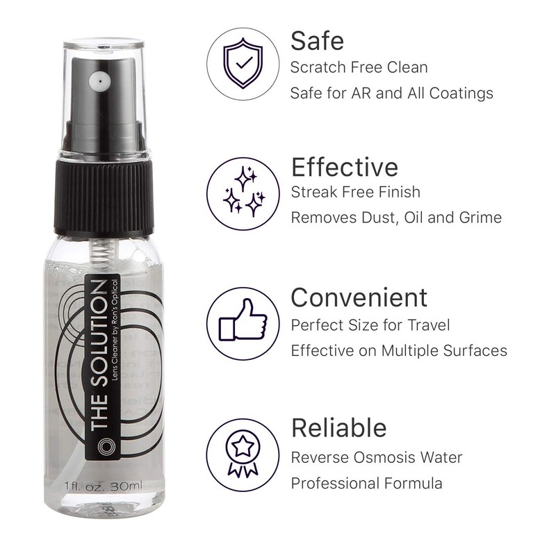 The Solution Lens Cleaner by Ron’s Optical cleans the first time WITHOUT smearing or streaking. Formulated Alcohol Free and Ammonia Free, our lens cleaner is perfect for more than just cleaning eyeglasses. Safely and effectively clean all your lenses.