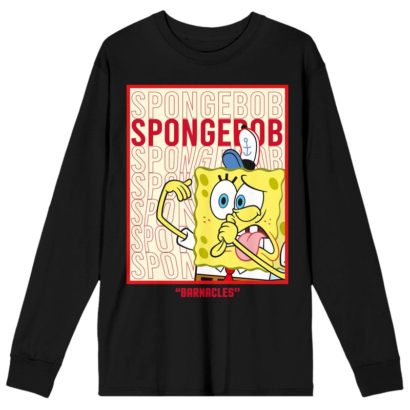 - LONG-SLEEVES - The SpongeBob SquarePants Black �Barnacles� Mens Long Sleeve Tee features long sleeves that look and feel comfortable in cooler weather.
