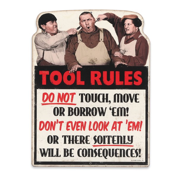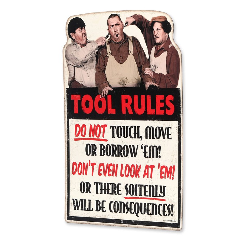 - The Three Stooges official product: Whether it's a bop in the head or a poke in the eye, one thing is clear - repercussions will be in order for anyone who dares to touch your tools! Featuring everyone's favorite Three Stooges, this sign combines humor with a gentle warning about your hard-earned tool collection.