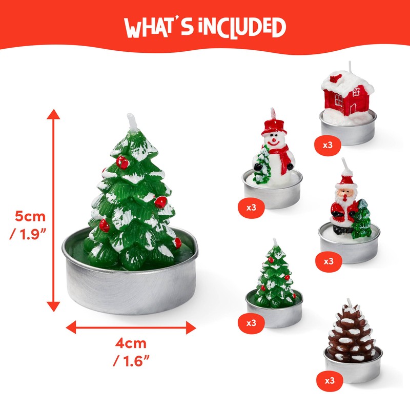- VARIOUS DESIGNS - Our set of 15 small tea lights contains 5 different designs, from snowy pine cones and Christmas trees to snowmen and Santa figurines.