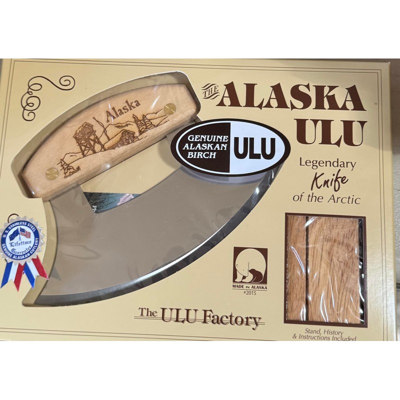 The Ulu Factory Alaska Birch Ulu Knife 6" Stainless Steel Blade with Block Wood Stand Cache. Made in the USA