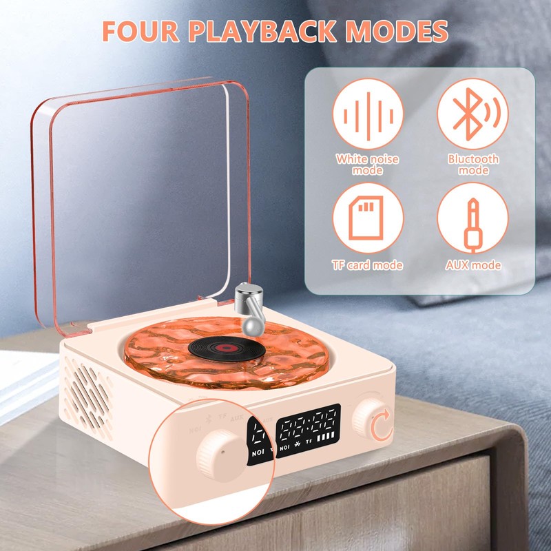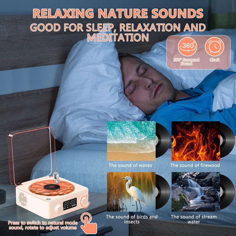 - RELAXING NATURAL SOUNDS FOR INCREASED SLEEP QUALITY: By gently moving the tone arm of the turntable, you bring the peace of nature into your bedroom. With four integrated natural white noise that soothe body and mind, the waves vinyl player improves your sleep quality and provides a relaxing atmosphere for a restful bedtime.