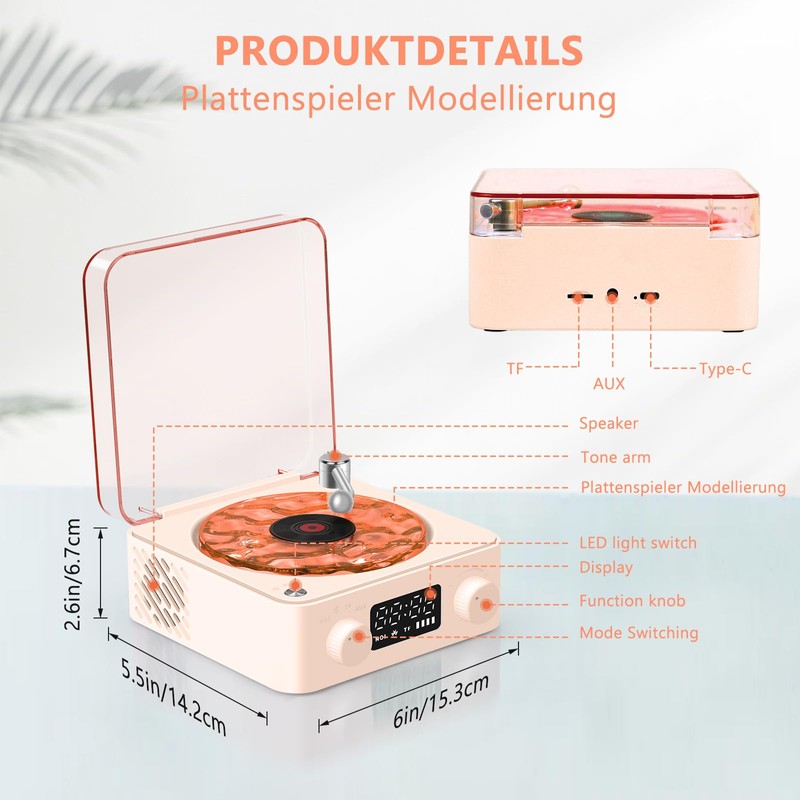 - Record player with loudspeaker: discover the perfect combination of classic beauty and modern technology with our record player. With wireless Bluetooth connection, LED bedside lamp and 360° stereo sound, it offers an unparalleled music experience. Let yourself be surrounded by the emotional beauty of music in a three-dimensional scene and enjoy the classic and modern aesthetic in real time.