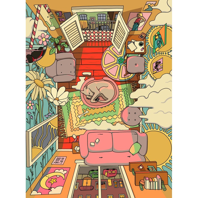 - ARTISTIC STYLE: Whimsical illustration featuring a cozy room interior with vibrant pink, green, and golden tones perfect for home decoration