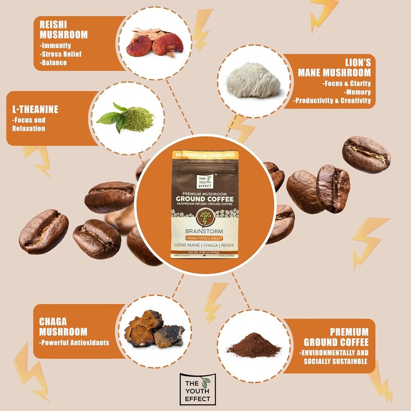 The Youth Effect Canadian Mushroom Coffee – Boost productivity and immunity with organic Lion's Mane, Chaga, and Cordyceps mushrooms.