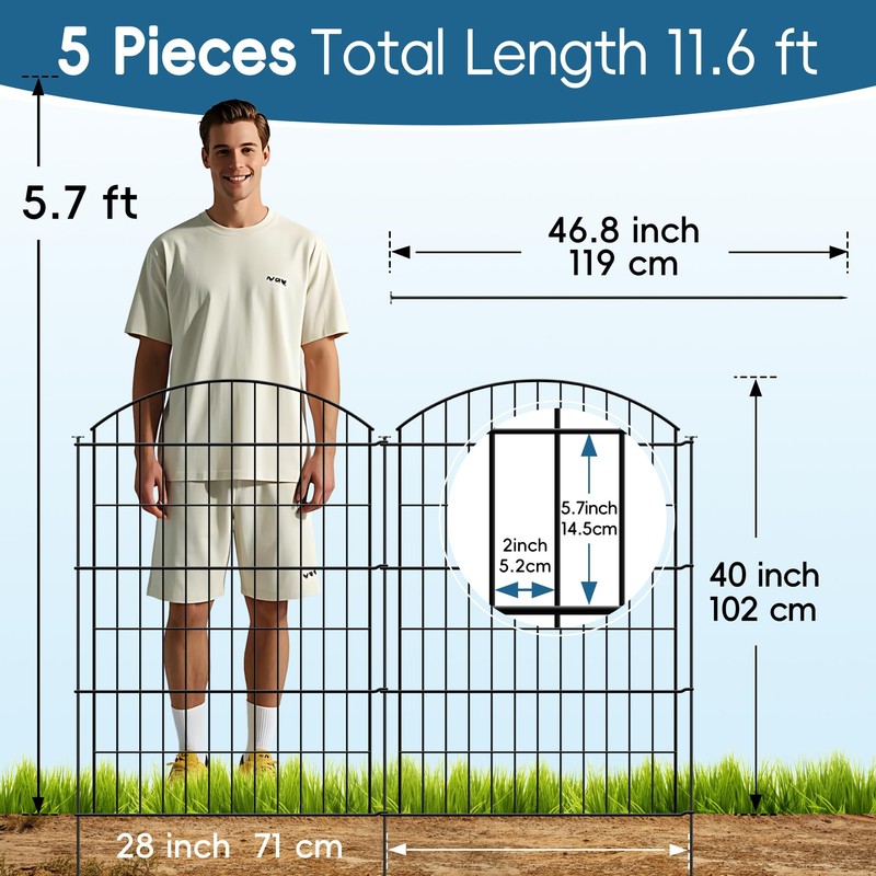 - 【Product Size】Each garden fence set contains 5 fence panels and 6 metal stakes, with each panel measuring 40 inch in height and 28inch in width. Once connected using the metal stakes, a garden fence can be assembled to a height of 40 inches and a length of 11.6 feet.
