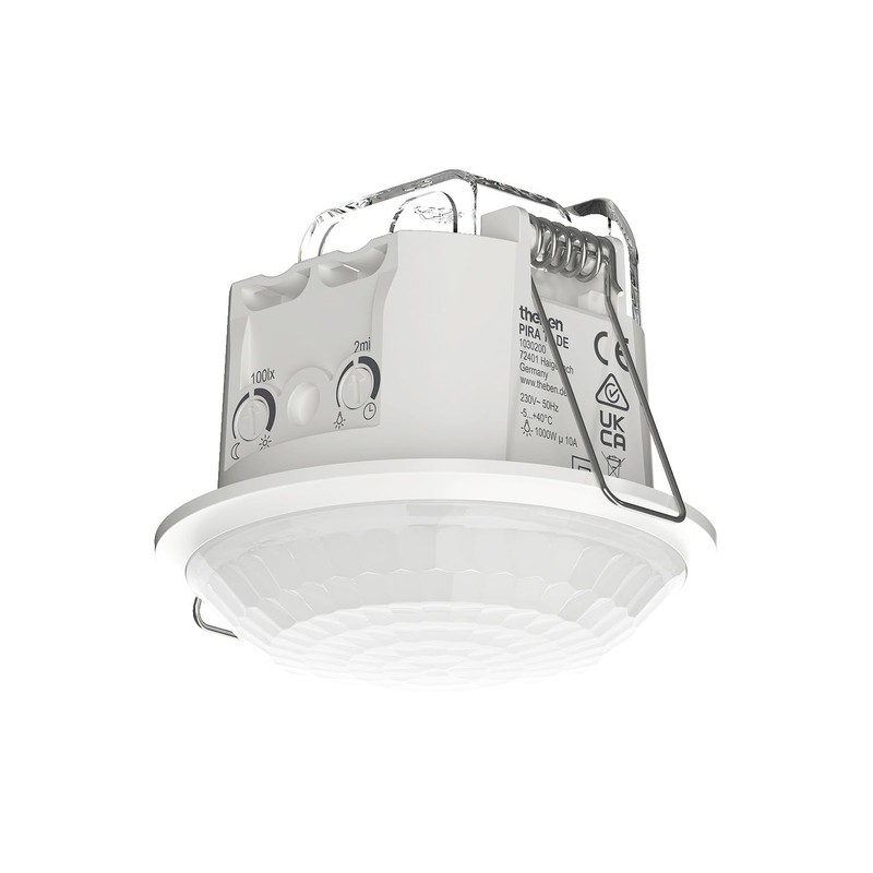Theben 1030200 PIRA T8 DE Motion Sensor for Indoor Use, 200 W LED, Detection Range Round 360°, Diameter 8 m, Time Time 5 s - 15 Minutes, Ceiling Installation