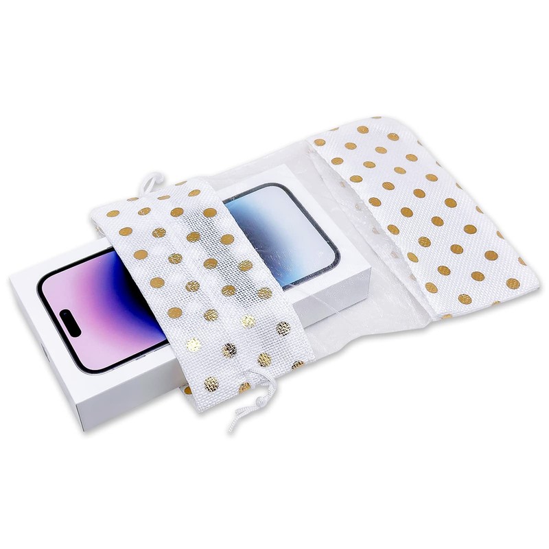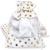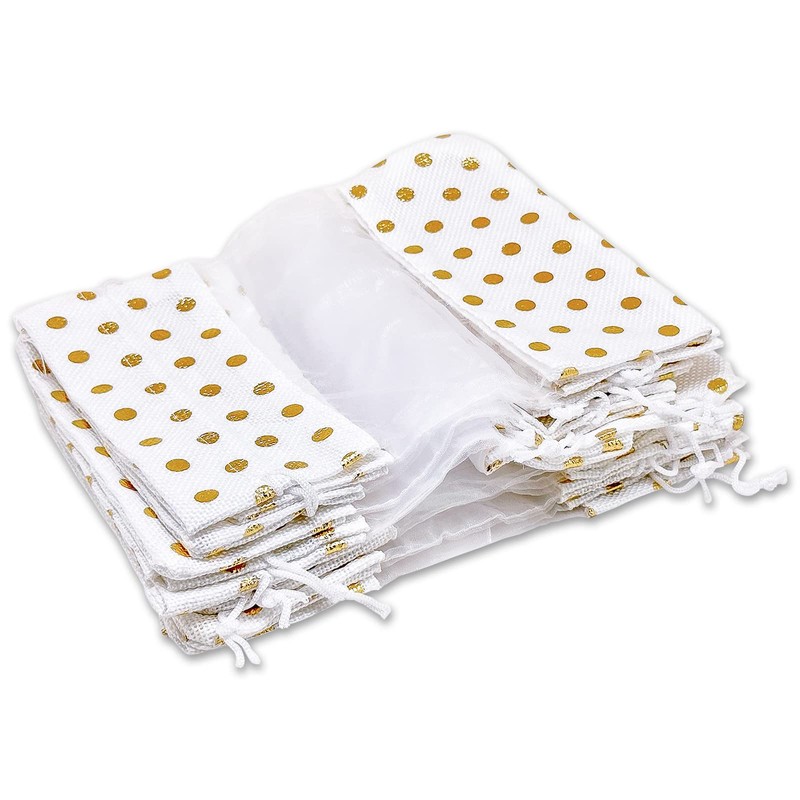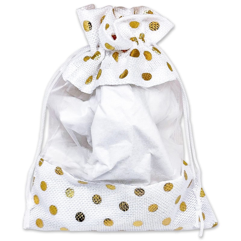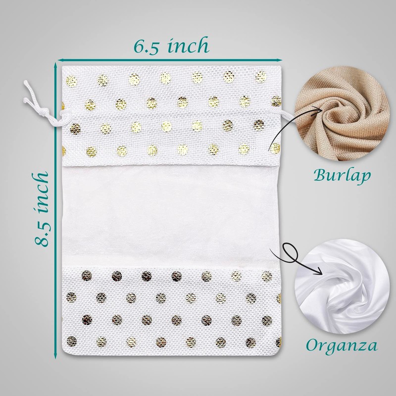 TheDisplayGuys - 12-Pack 6.5x8.5 Linen Burlap & Organza Gift Bags with Drawstring - for Party Favors, Presents, Samples & Treats - White/Gold Polka, Large
