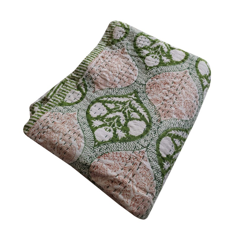 thehandicraftworld Cotton Kantha Quilt Blanket, Green Floral Print, 90x108 Inch