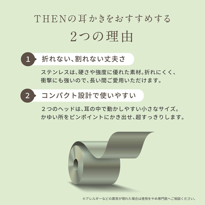 - ✅【ごっそり!たっぷり!気持ちいいほどに取れる!】THENの耳かきは、耳あかのタイプ別に使い分けができる2way形状。乾性タイプにおすすめなのは、日本人になじみのある[スプーン型]。こびりついた耳あかをねこそぎかき出します。乾性・湿性の両タイプにおすすめなのが、耳あかをしっかりからめ取るネジ形の[スパイラル型]。くるくると回転すれば、360度全方位からすっきり取ることができます。