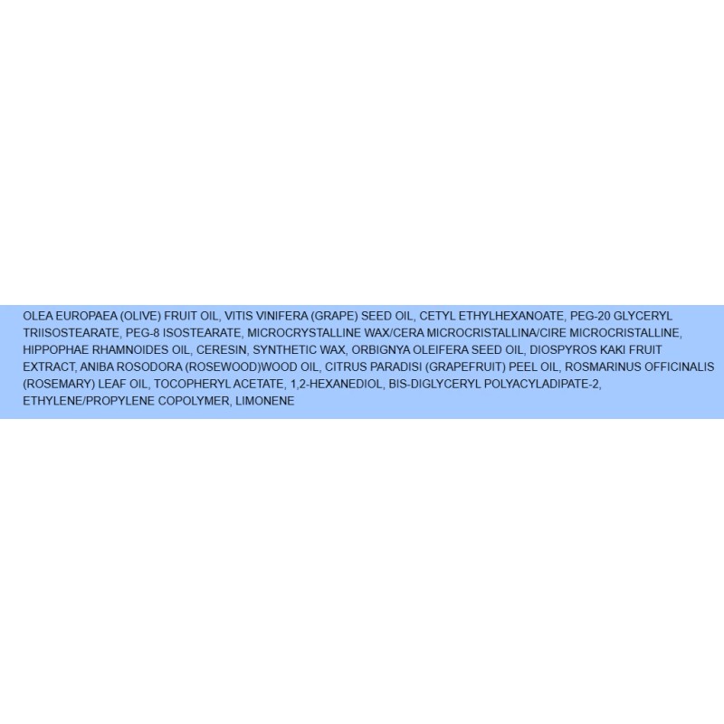 Ingredients: OLEA EUROPAEA (OLIVE) FRUIT OIL, VITIS VINIFERA (GRAPE) SEED OIL, CETYL ETHYLHEXANOATE, PEG-20 GLYCERYL TRIISOSTEARATE, PEG-8 ISOSTEARATE, MICROCRYSTALLINE WAX/CERA MICROCRISTALLINA/CIRE MICROCRISTALLINE, HIPPOPHAE RHAMNOIDES OIL, CERESIN, SYNTHETIC WAX, ORBIGNYA OLEIFERA SEED OIL, DIOSPYROS KAKI FRUIT EXTRACT, ANIBA ROSODORA (ROSEWOOD)WOOD OIL, CITRUS PARADISI (GRAPEFRUIT) PEEL OIL, ROSMARINUS OFFICINALIS (ROSEMARY) LEAF OIL, TOCOPHERYL ACETATE, 1,2-HEXANEDIOL, BIS-DIGLYCERYL POLYACYLADIPATE-2, ETHYLENE/PROPYLENE COPOLYMER, LIMONENE.