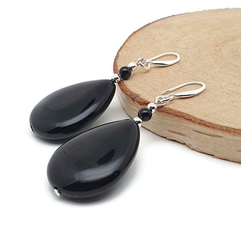 - The earrings are made with teardrop-shaped black Agate beads and are available in various teardrop shapes: Slim, 3x1 cm smooth, and faceted teardrop beads. Larger, 4 x 1.2 cm smooth teardrop beads. Wide, 3 x 2.2 x 0.9 cm teardrop beads