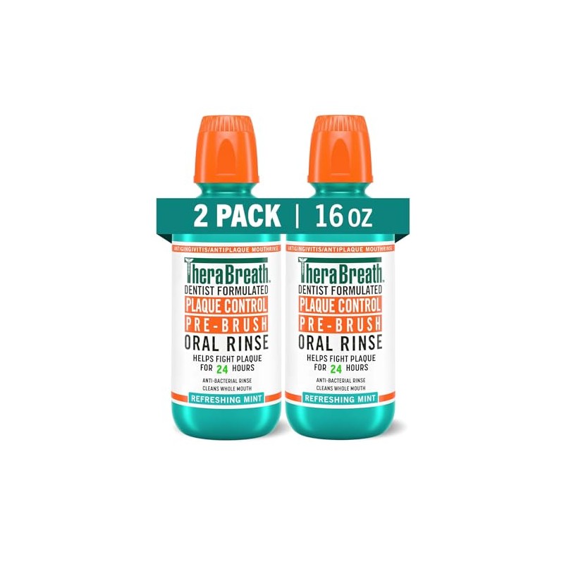 - Two 16 fl oz bottle of TheraBreath Plaque Control Pre-Brush Oral Rinse, antigingivitis and antiplaque rinse, Refreshing Mint flavor