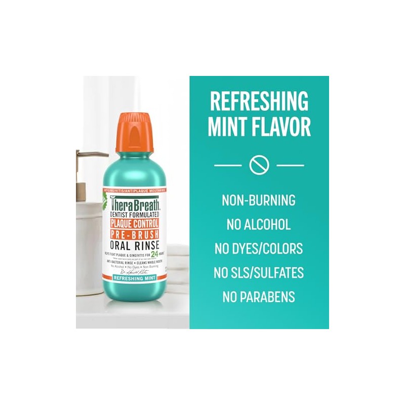 - TheraBreath Plaque Control Pre-Brush is an alcohol free mouthwash with a breath-freshening ingredient that doesn't burn your mouth; also contains no dyes, no colors, no SLS/sulfates, and no parabens