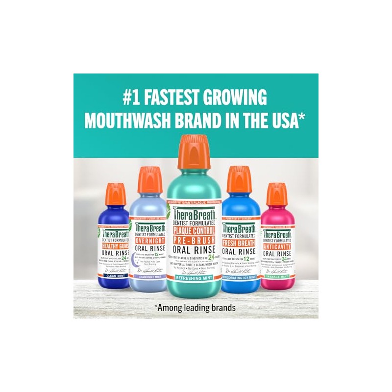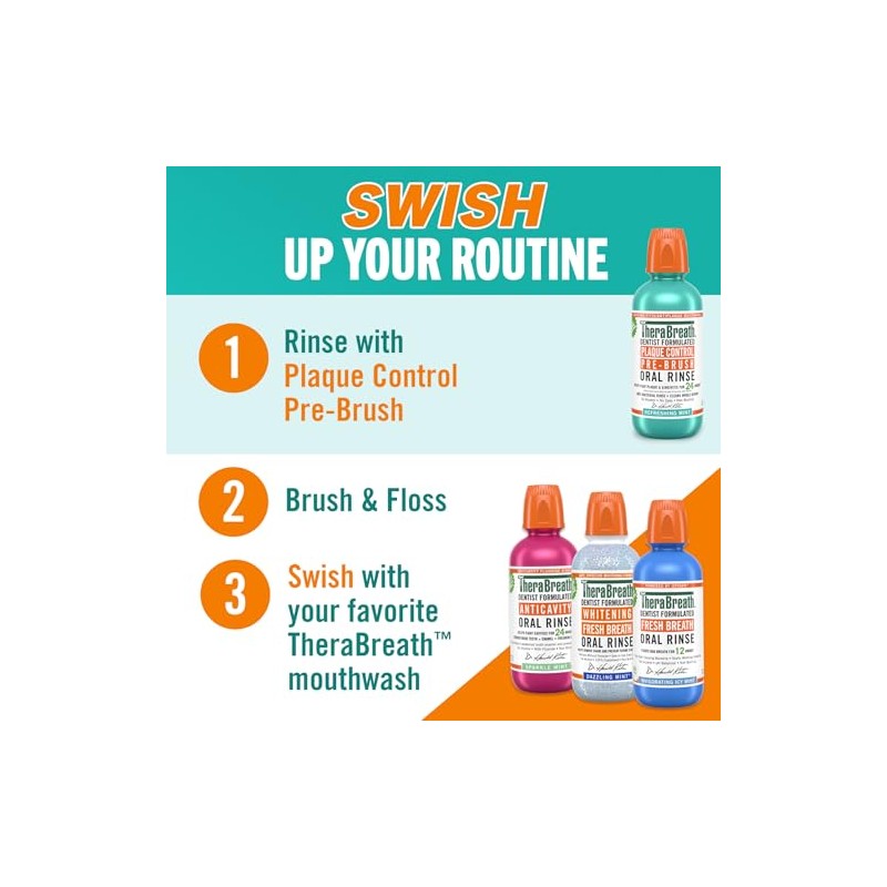 Swish up your oral care routine with TheraBreath Plaque Control Pre-Brush Mouthwash. This plaque remover mouthwash is a pre-brush rinse formulated to help fight plaque and gingivitis for 24 hours, when used as part of an oral care routine. It's an antibacterial, antiplaque, and antigingivitis oral rinse in a Refreshing Mint flavor. TheraBreath Plaque Control Pre-Brush is a dentist-formulated alcohol free mouthwash with a breath-freshening ingredient that doesn't burn or irritate your mouth. This no-alcohol antigingivitis and antiplaque rinse contains no dyes, no colors, no SLS/sulfates, and no parabens. It's not tested on animals and is certified vegan, gluten free, BPA free, and kosher. For a whole mouth clean, rinse with TheraBreath Plaque Control Pre-Brush Oral Rinse, brush, floss, and then swish with your favorite TheraBreath Mouthwash. It's swishy time with TheraBreath, the number-1 fastest growing mouthwash brand among leading brands in the USA.