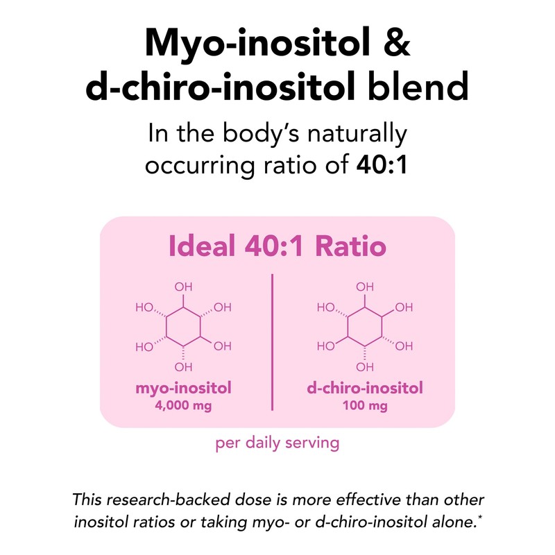- Ovulation Support Supplement: This supplement provides 4000 mg myo-inositol and 100 mg D-chiro inositol daily in your natural ratio of 40:1, which is twice the typical daily dose from other inositol supplements*