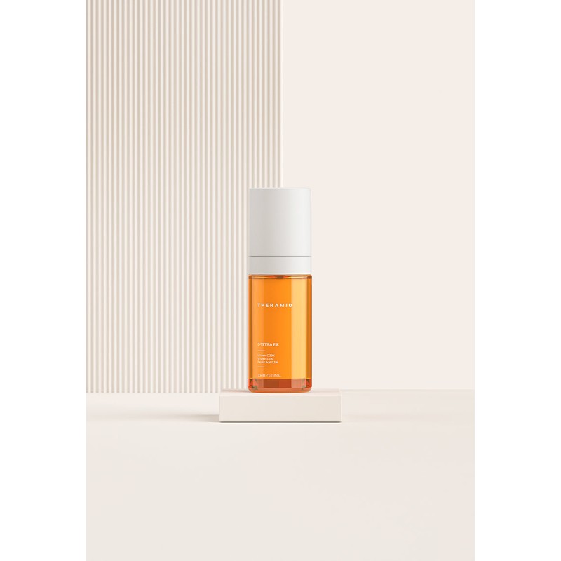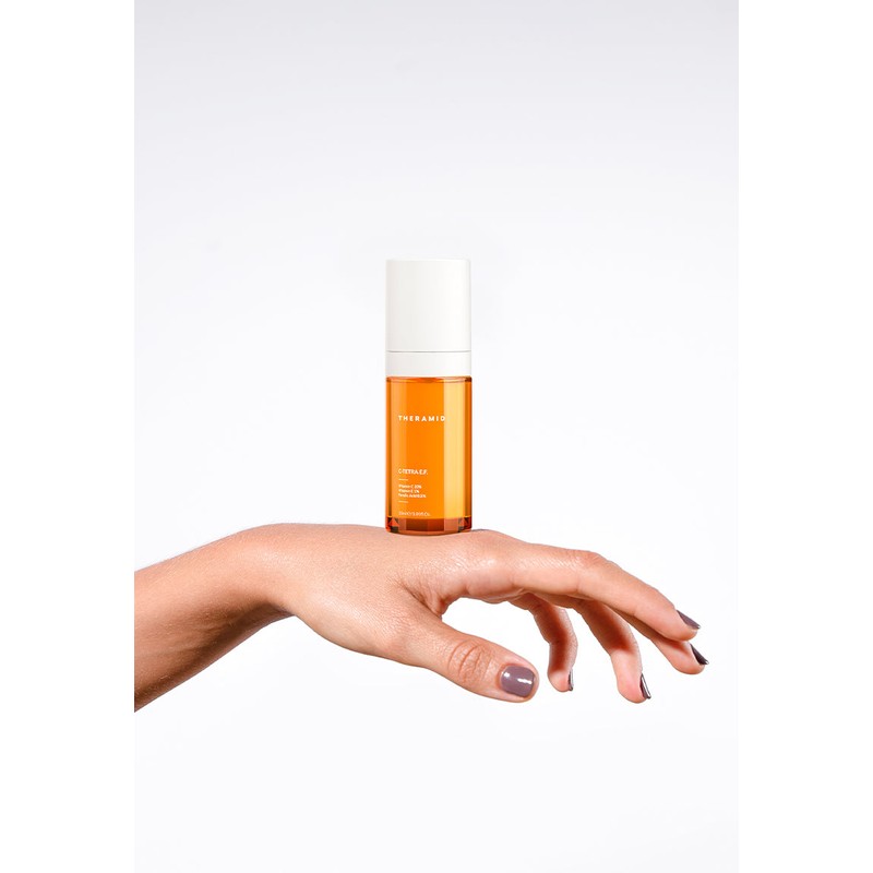 Formulado con un 10% de Vitamina C Tetra, altamente biocompatible y liposoluble. El hecho de ser liposoluble, permite transportar esta vitamina, hasta las capas más profundas de la piel. Aquí su acción se centra en los melanocitos (para tratar las manchas desde el interior) y en la síntesis de colágeno, para prevenir y combatir las arrugas desde el interior. Complementan su fórmula el Ascorbosilane y Ascorbyl Glucoside, otros dos derivados de la Vitamina C, muy estables e hidrosolubles. Estos, actúan en la superficie de la piel mejorando la luminosidad y atenuando las manchas más superficiales.