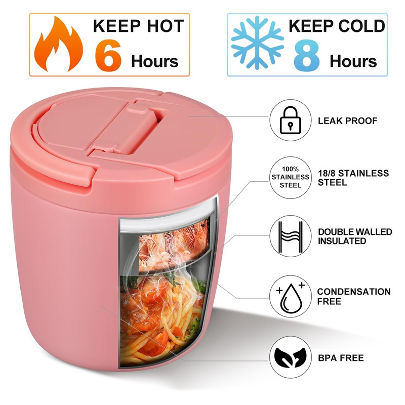 - Insulated lunch box: the hot food container is made of food-safe 18/8 stainless steel with a double-walled vacuum insulation design. It can store heat for 6 hours and cold for 8 hours. Whether for longer trips or daily lunch in the office, this thermal container effectively keeps your food at the ideal temperature