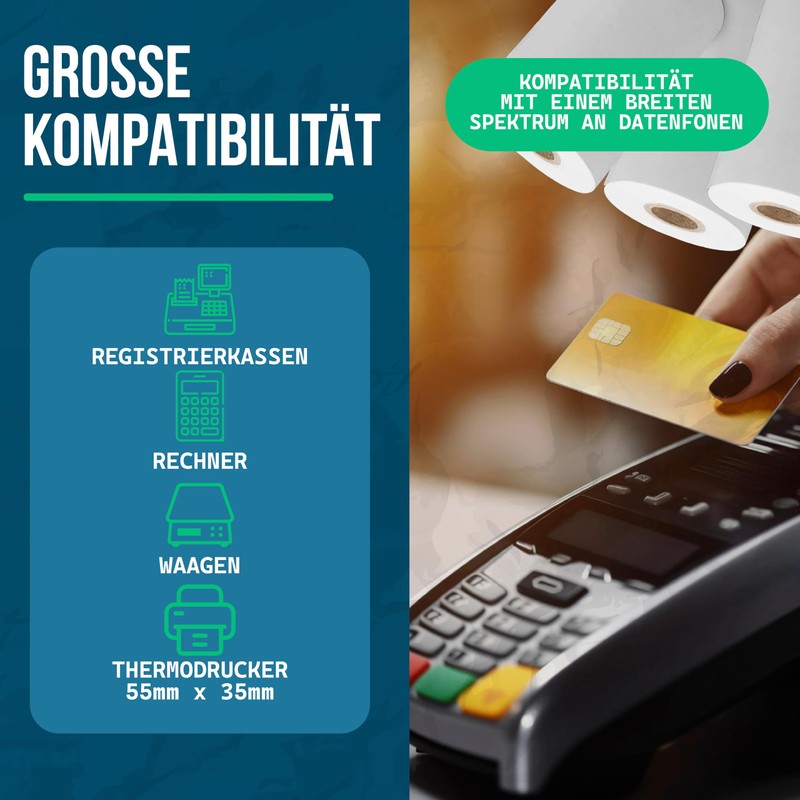 The POS paper rolls are suitable for Dataphone, Sumup, cash registers, touch POS thermal receipt printers and even for calculators. The applications for document generation are endless.