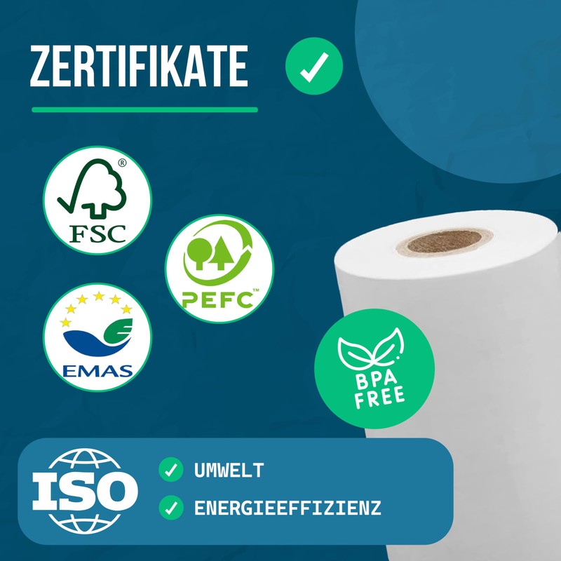 Due to the high European standards, our POS paper meets the following standards: FSC, PEFC, EMAS, ISO 14001 environment, ISO 50001 energy efficiency, ISO 90001, ISO 54001 and BPA free.
